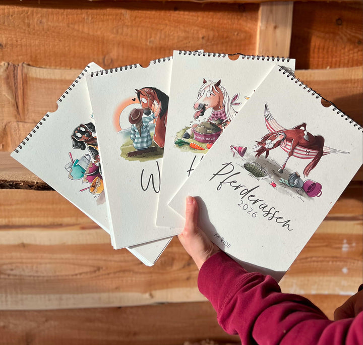 Unsere Pferdekalender und Hundekalender mit liebevoll gestalteten Motiven und originellen Wortspielen zaubern Monat für Monat ein Lächeln ins Gesicht – eine originelle Geschenkidee für Reiter, Pferdefreunde und Hundebesitzer.